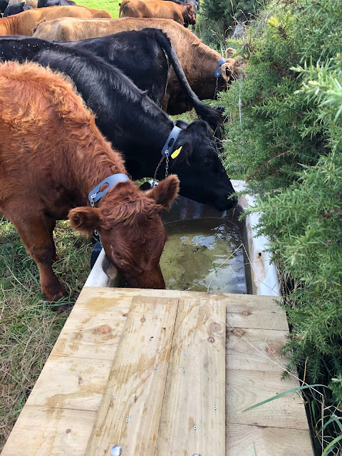 You might have been thinking – what are those things around the cows necks? – Good question… we are trialling a system from Norway that uses GPS to map a ‘virtual’ boundary which communicates to these collars on our cows. When they come within 2-3m of this boundary an audio warning is issued that gets faster and higher, if they push through this they receive an electric pulse on the neck which turns them away. After training them to this system for a few days they respond to the audio nearly every time.