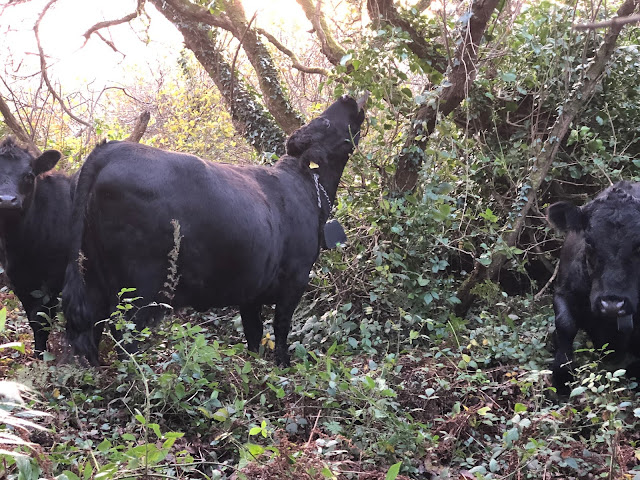 In here they have bramble, ivy, rush, birdsfoot trefoil to browse amongst grasses. It is easy to see that cows are a woodland species in this environment, they were straight in the wood finding scratching posts
