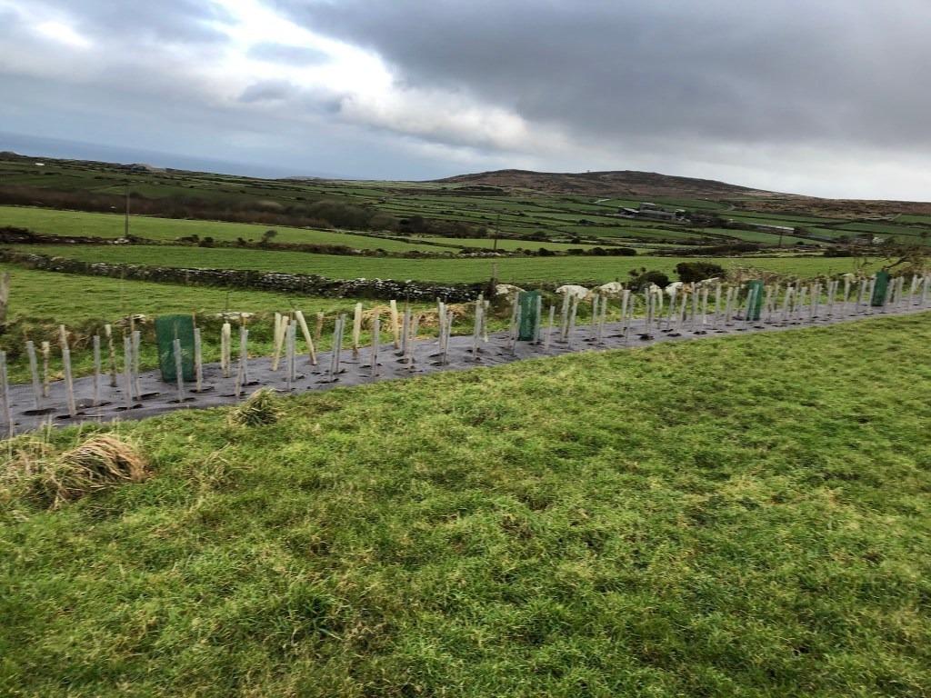 About three thousand are being planted in 600m of new hedgerow – alongside existing stone hedges and to recreate old field boundaries. These are mostly hawthorns and willow with occasional hazel, holly, sea buckthorn, dog rose, alder and holm oak. Our hedgerows are an invaluable wildlife habitat and create a crucial network. They also develop resilience in our landscape and help to moderate climate extremes. They are an important carbon sink and provide valuable alternative and medicinal forage for our cows as well as shelter. It’s a challenging landscape here so I tend to plant close and in 3 rows.